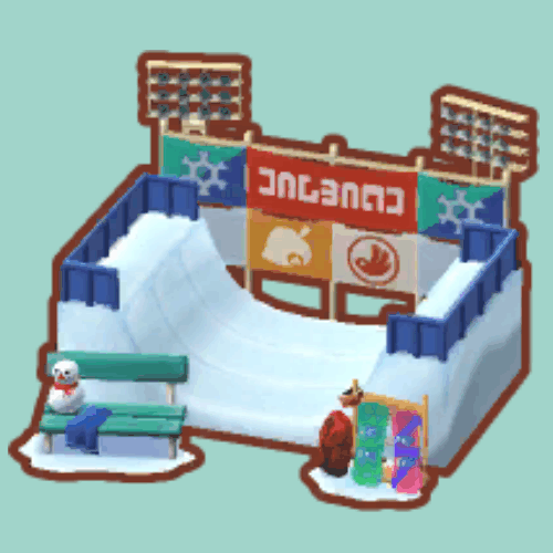 キャンプ場に「スノーハーフパイプ」を設置すると、住人が滑って遊ぶ可愛らしいリアクションが見られる。イベント期間しか入手できないオブジェなので、期間中に必ず入手しておこう。