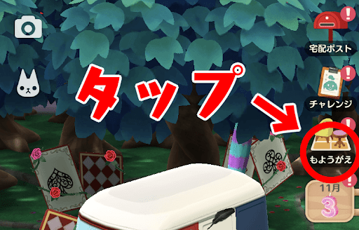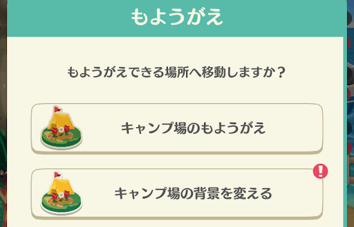 キャンプ場の模様替えを行う場合は、画面右上にある「もようがえ」をタップしよう。キャンプ場以外の場所だと表示が少し変わり、「キャンプ場のもようがえ」を選択する必要がある。