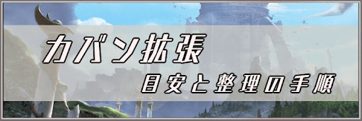 ただし、カバンの容量の目安はよく周回するクエストと周回スピードに依存する。そのため、特定の拡張数をオススメしづらい。自分の環境に合わせて調整しよう。