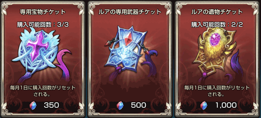 ルアの証100個でランダムチケットを購入するなら、350個で専用宝物チケットを購入して欲しい宝物を確実に入手しよう。