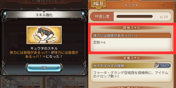 探検時に隊員を連れて行けるようになった後は、隊員との仲良し度を上げると周回効率がUPする。探検エリアのステータスが推奨を越えられる時は、仲良し度Lv3で貰える仲良し度UP装備を付けて隊員との仲良し度を上げ、スキル効果や発動率を上昇させるのがおすすめ。