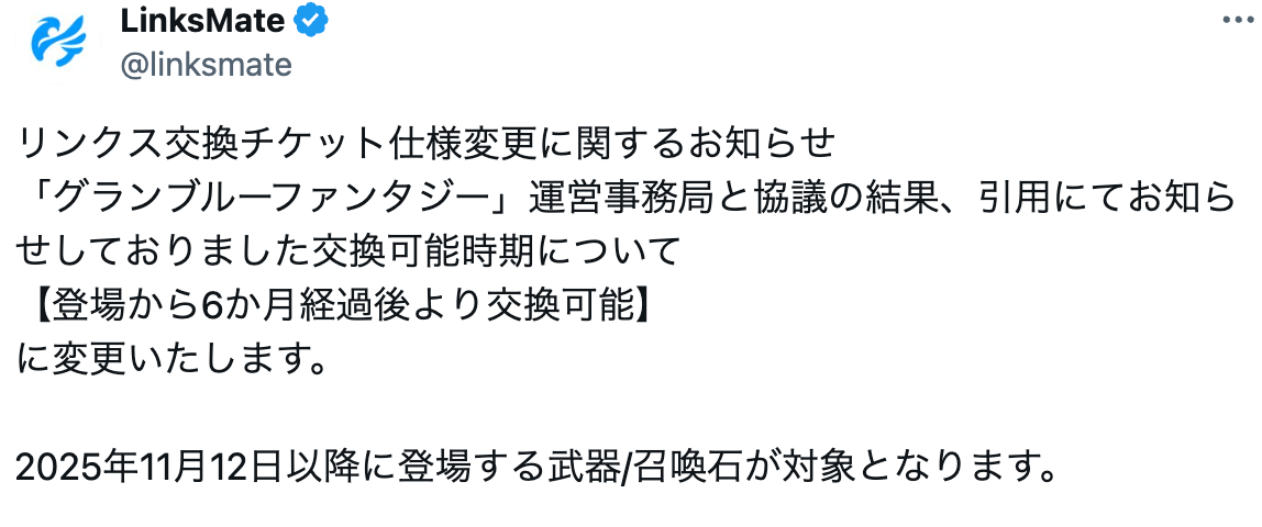 2025年11月のグランデフェス以降に実装されるキャラや召喚石は、登場からすぐには取れなくなり、登場から半年後から取れるように変更される。上記の仕様変更によって、今までのように限定キャラをすぐに取る運用が行えなくなる点に注意。