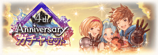 グラブルが3/10(土)を持って4周年を迎えることを記念し、一部を除く好きなキャラ、武器、召喚石と交換できる「4thアニバーサリーガチャセット」が3/16(金)18:59まで販売している。