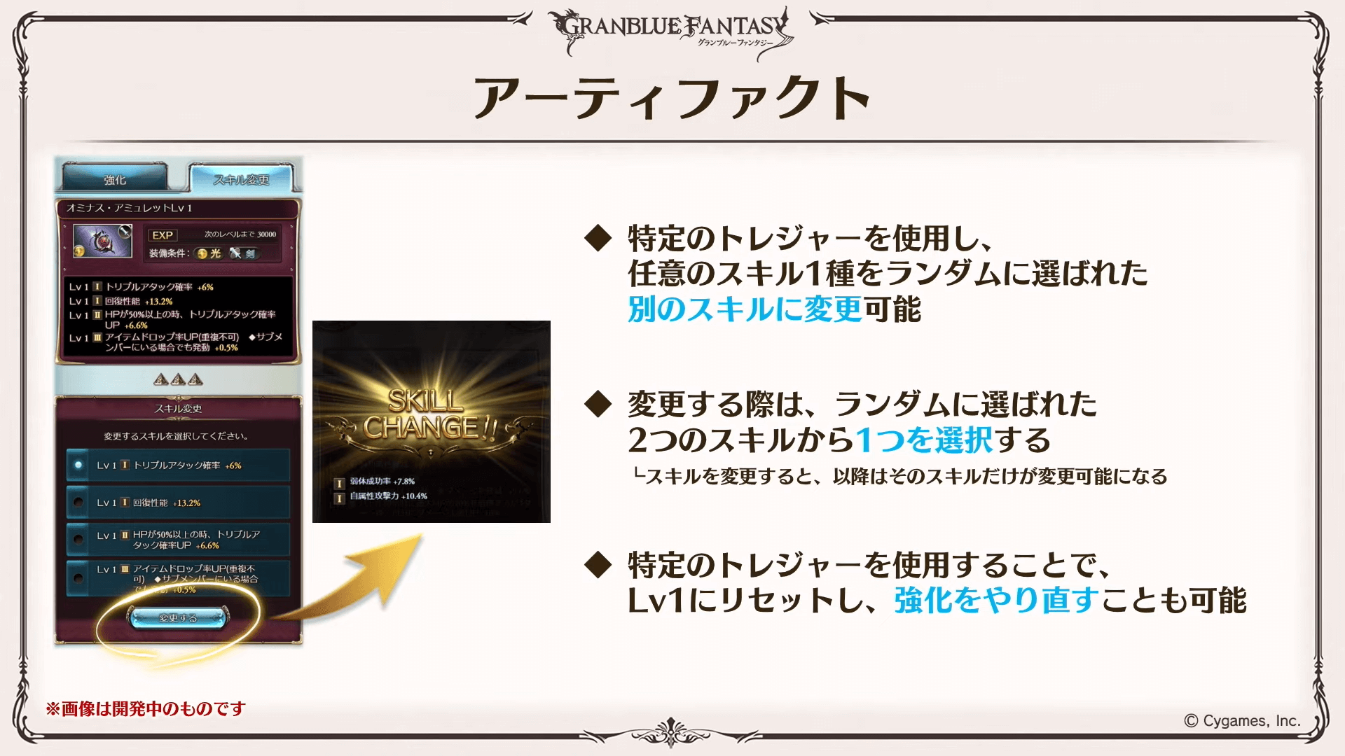 アーティファクトに特定のトレジャーを使用するとスキル変更やレベルのリセットができ、厳選をしやすくなる。ただし、アイテムは貴重なため、ドロップの厳選で強力な効果が付いたアーティファクトにのみアイテムを使おう。
