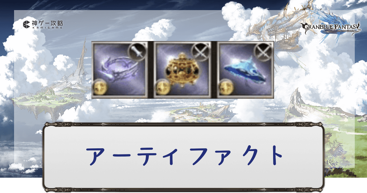 グラブルのアーティファクトについて紹介。アーティファクトの当たりスキルや古戦場向けキャラのおすすめAF、ドロップ率などを掲載している。グランブルーファンタジーで、アーティファクトの厳選をする際の参考にどうぞ。