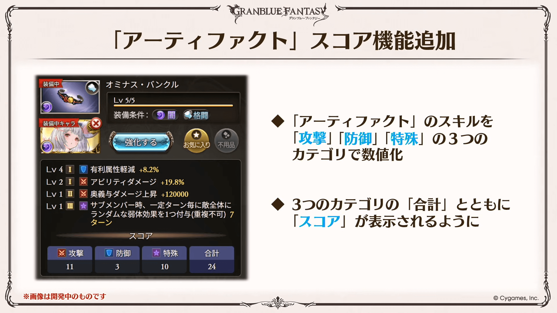 3月10日のアップデート時にスコア機能が追加される。「攻撃」「防御」「特殊」カテゴリでそれぞれ数値化され、合計を算出する仕様だ。スキルの方向性ごとに評価するため、防御に寄せた高難度向けアーティファクトであっても評価され、分解するかの判断を取りやすい。