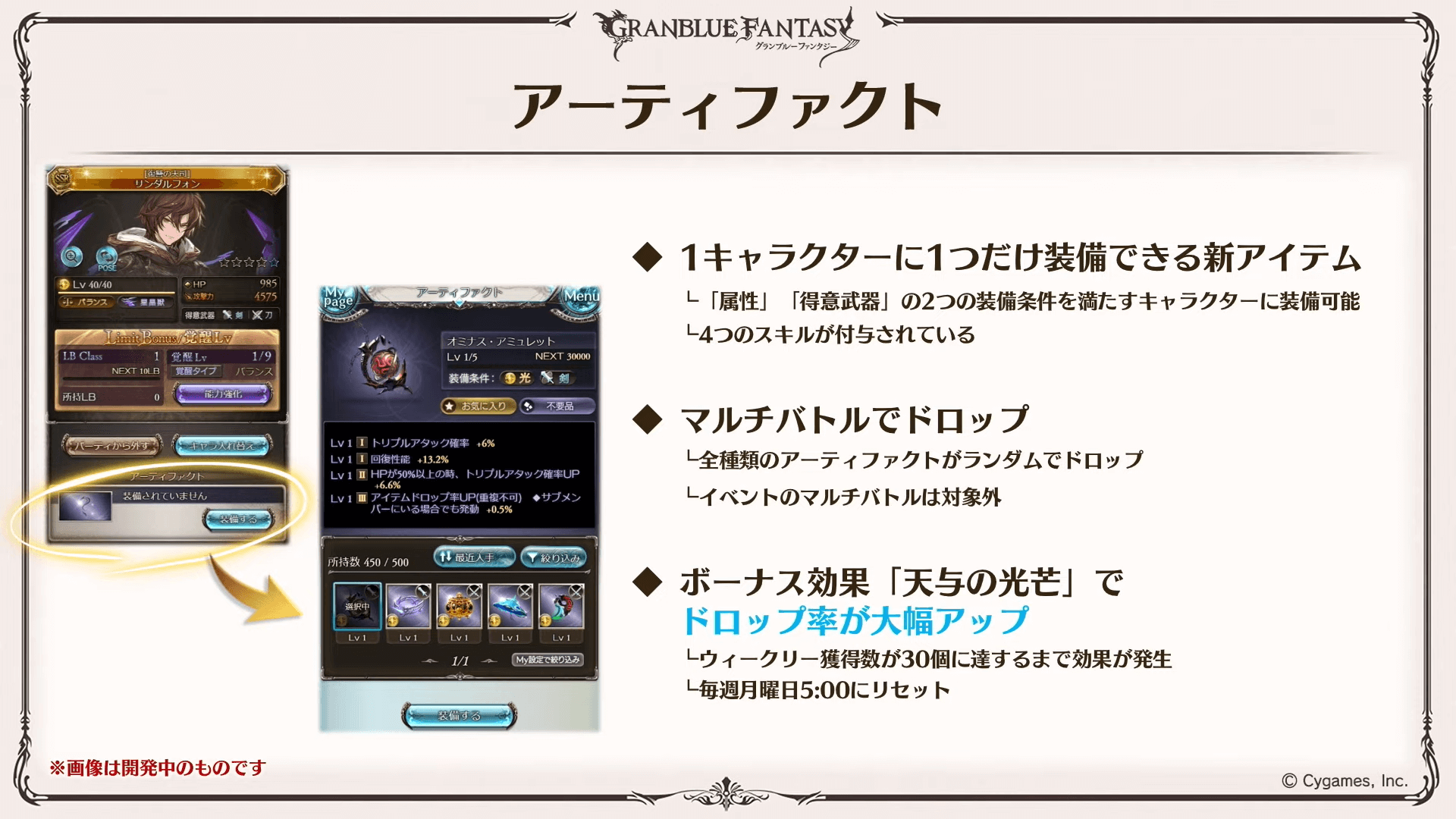 アーティファクトは通常のマルチバトルで入手できるキャラ強化要素の1つ。週に30個までは「天与の光芒」効果でドロップしやすくなっており、アーティファクトを分解した素材を使って錬金術の工房で新しく作成も可能。なお、イベントマルチでは入手はできない。
