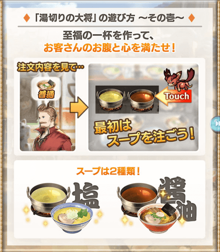 「湯切りの大将」とは、グラブルのイベント「カシウスのらぁめん旅行記」のミニゲーム。お客さんの注文に合わせて「スープ」「麺」を選んでラーメンを作るとスコアを獲得できる。