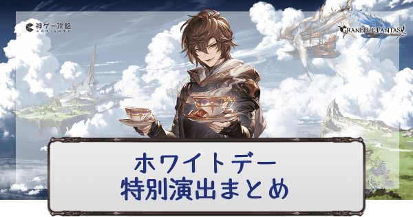 グラブル(グランブルーファンタジー)のホワイトデー限定メッセージが見れる「HAPPY WHITEDAY!キャンペーン」の限定会話と特別演出を掲載。プレゼントの渡し方、プレゼントを貰えるキャラ一覧も紹介。ホワイトデーキャンペーンを楽しむ際の参考にどうぞ。