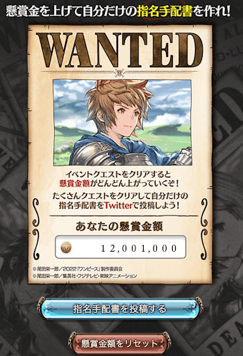 | やること | ・イベクエをクリアして懸賞金を上げる ・Twitterに投稿する |