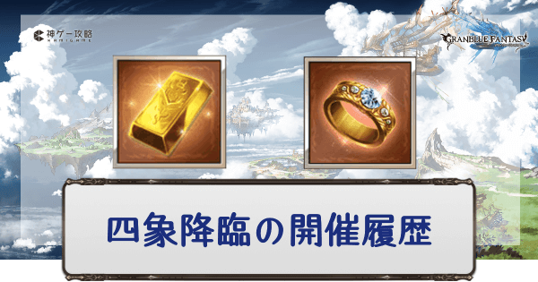 グラブルのイベント「四象降臨」の開催履歴をまとめて掲載。開催年月や次回の開催予想、ヒヒイロや久遠の在庫の追加ペース、開催時に行われた仕様変更の詳細もまとめているので参考にどうぞ。