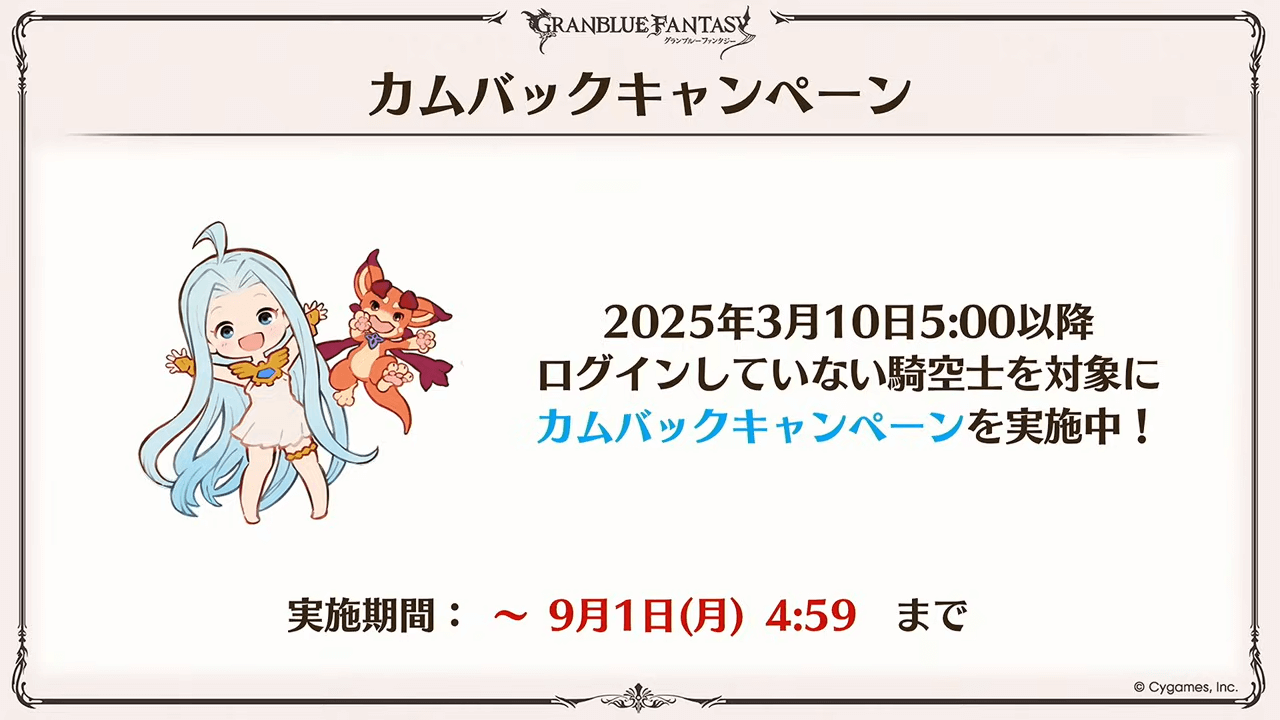 カムバックキャンペーンは、2025年3月10日5時以降にログインしていない騎空士が対象の復帰キャンペーン。招待コードを入力して復帰すると、様々なアイテムを受け取れる。