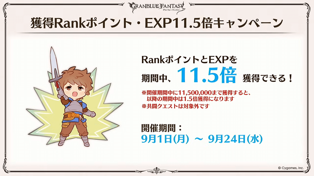 | Rankポイント・EXP11.5倍CP | 9月1日~9月24日 |