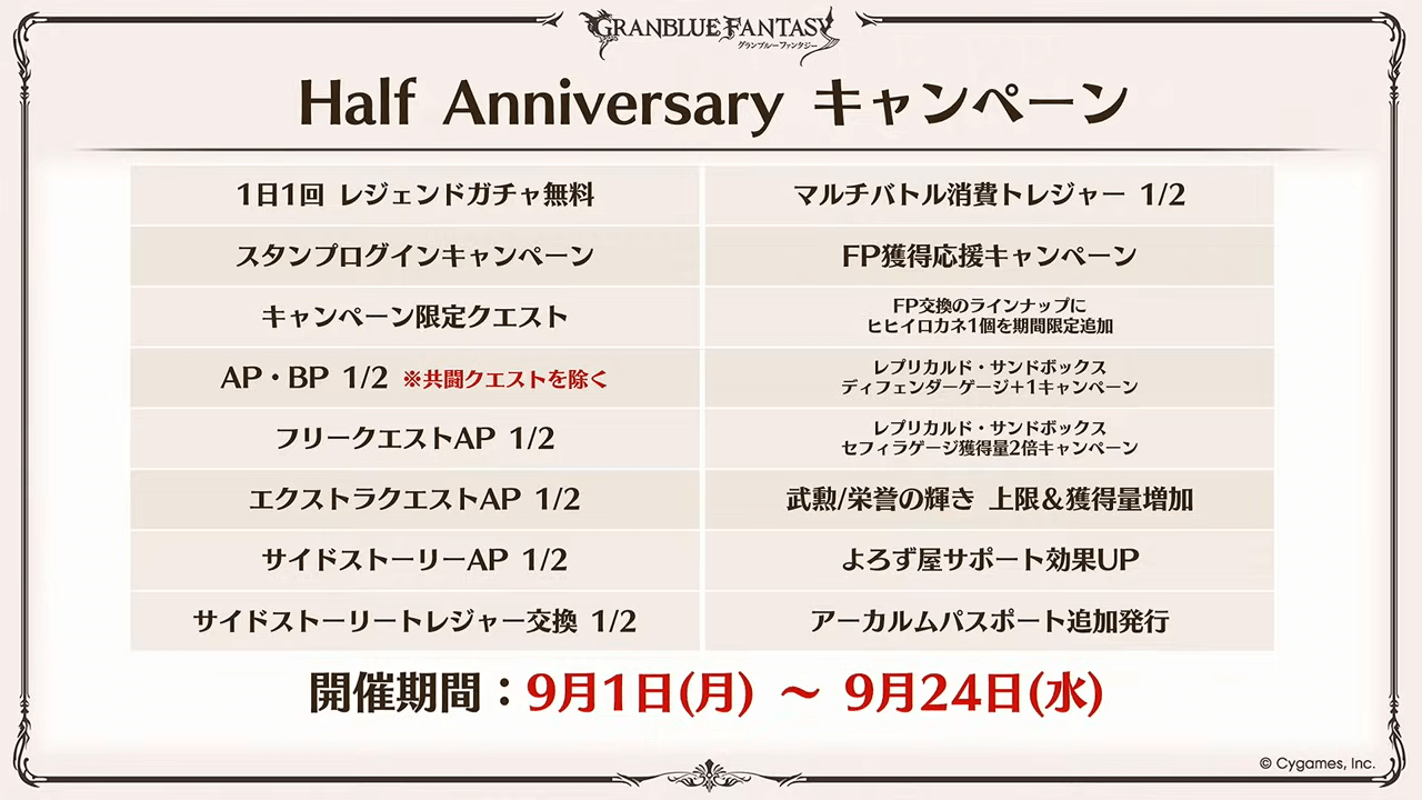 | Half Anniversary CP | 9月1日~9月24日 |