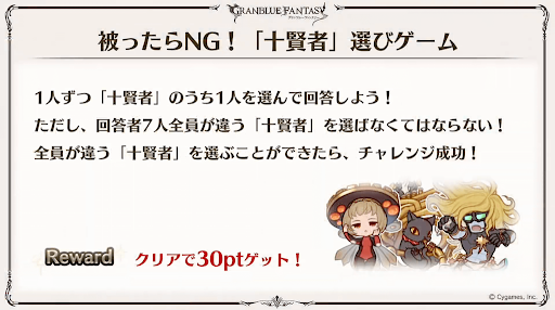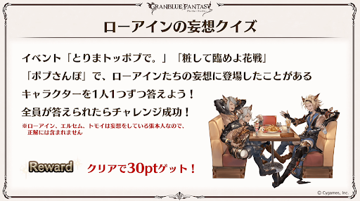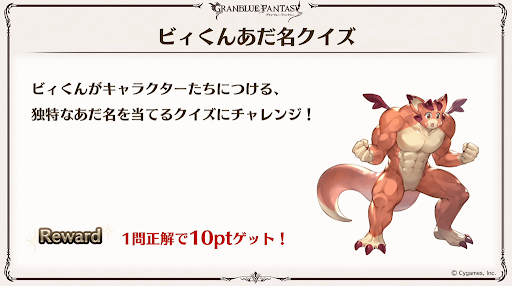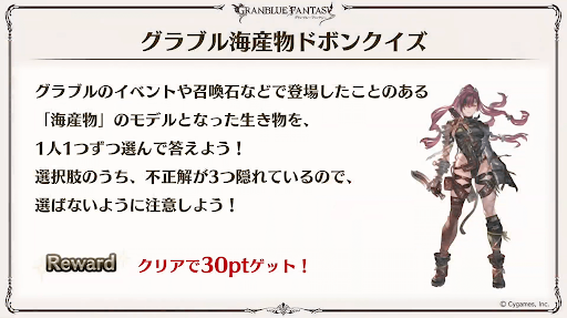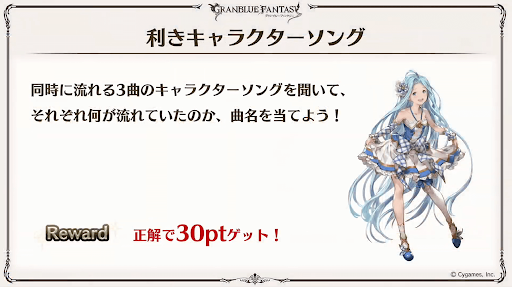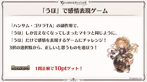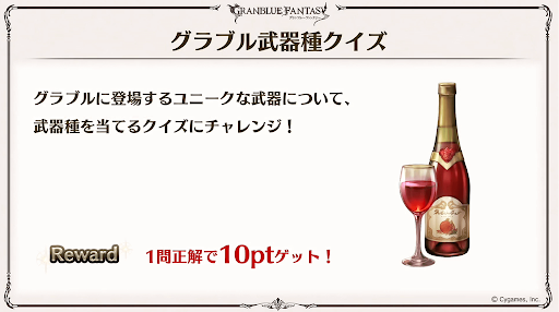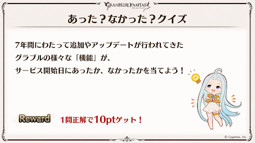グラブルの歴史から問題が出題される。解答したポイントに応じてゲーム内アイテムが貰える。