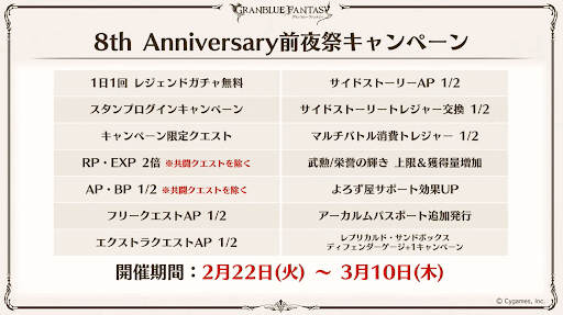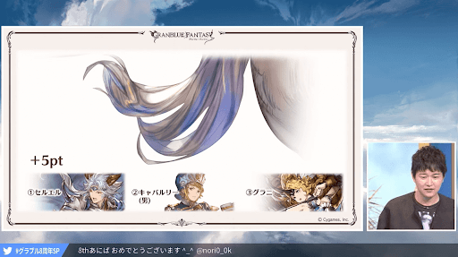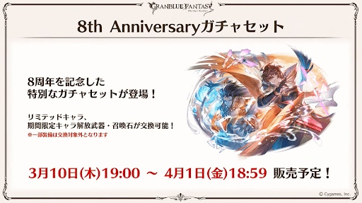 | 開催概要 | 3月10日に8周年を迎えるグラブルの記念生放送。最新情報の発表や「ここだけレポート」が行われた。バラエティ企画の報酬でユーザーへのプレゼントも配布された。YouTubeでアーカイブ配信を視聴できる。 |