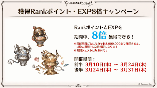 | RANKとEXP8倍 | 前半3/10(木) 〜 3/24(木)後半3/24(木) 〜 3/31(木) |