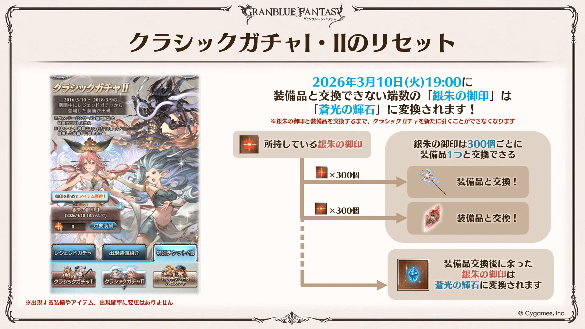 クラシックフェスで「銀朱の御印」が余っている場合は、12周年前までに引き切ろう。天井交換に使える「銀朱の御印」は3月10日19時にリセットされるためだ。250個以上貯まっているかつ神石が揃っていないなら宝晶石を使ってでも引くべきだ。