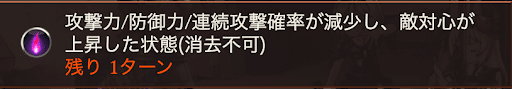 | 効果 | 敵の防御DOWN (30%/180秒) 自分に不浄効果 (3ターン) ・毎ターンHP減少 (10%/最大1,000) ・毎ターン奥義ゲージ減少 (10%) |