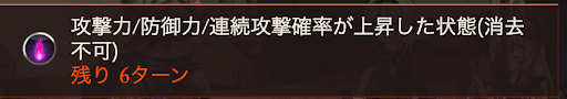| 効果 | 5ターンの間ステータスが大幅UP ・攻撃力UP (100%/別枠) ・防御力UP (100%) ・ダブルアタック確率UP (100%) ・トリプルアタック確率UP (50%) ◆ただし6ターン目にステータス大幅DOWN/敵対心UP ・攻撃力DOWN (50%) ・防御力DOWN (50%) ・連続攻撃確率DOWN (100%) ・敵対心UP (100%UP) ※4人パーティで100回中50回被弾 |