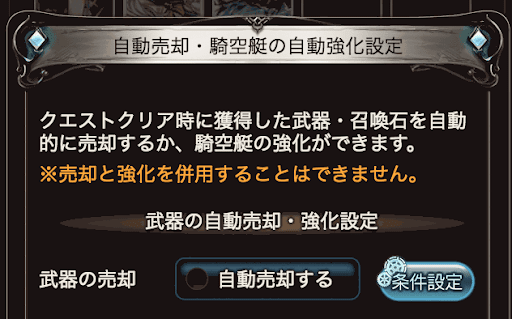武器の自動売却と騎空艇の自動強化は、どちらか一方のみしか設定することができない。自動売却と騎空艇の自動強化の設定は手動で切り替える必要があるため、自動売却のつもりが騎空艇の自動強化になっていた、なんてことのないように。