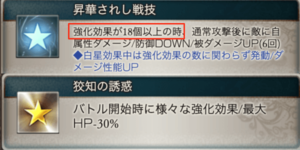| 強化効果が18個以上の時、通常攻撃後に敵に ・自属性ダメージ ・防御DOWN ・被ダメージUP(6回) ◆白星効果中は強化効果の数に関わらず発動/ダメージ性能UP |