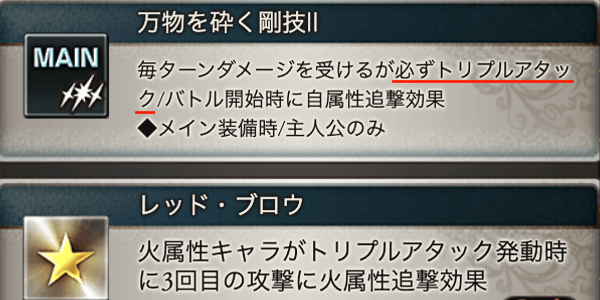 | 効果 | 自分の通常攻撃の与ダメージUP(1ターン) 必ずトリプルアタック(3ターン) 自属性追撃効果(3ターン) |