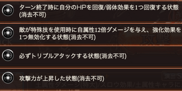 | 効果 | 敵に12倍自属性ダメージ(上限約170万) 敵の強化効果1つ消去 ◆敵が特殊技発動時に発動 |