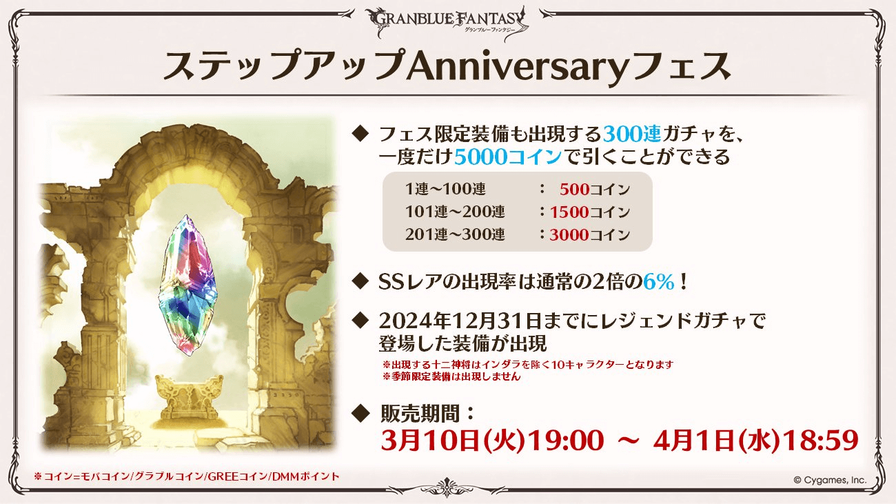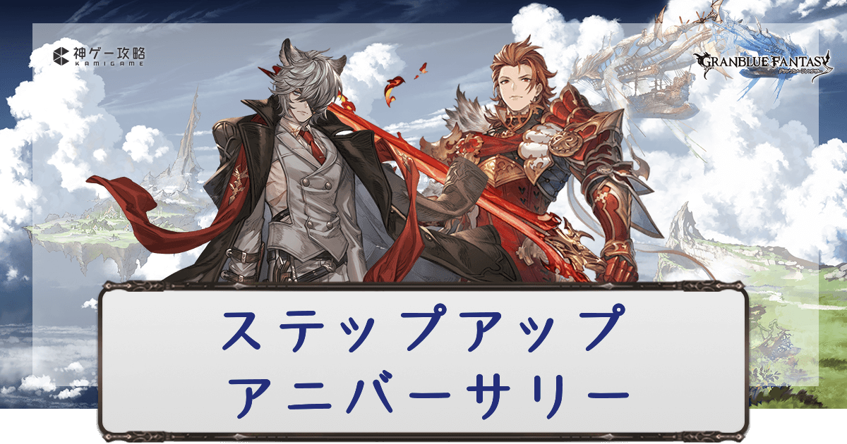 グラブル(グランブルーファンタジー)の「ステップアップAnniversary(アニバーサリー)フェス」について解説。ガチャを引くべきかについてや、開催内容や排出される対象、必要な課金額についても解説。課金をする際の参考にどうぞ。
