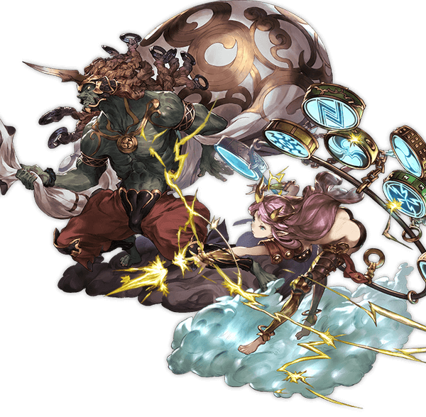 封印されし二柱の荒ぶる神は解放され、大いなる力を取り戻す。巨大な浮島をも容易く吹き飛ばす暴風と、万象を焦がす白熱の迅雷とが混ざり合った力の前に、全ての星晶獣は抵抗もなく塵となって消え失せる。双対揃いし神に死角はなし。 |