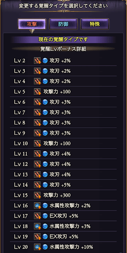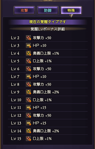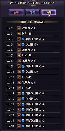 攻撃>奥義・奥義編成で使える ・奥義覚醒は過剰になりやすい |