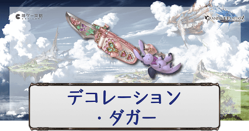 グラブル(グランブルーファンタジー)に登場するイベント武器のひとつ、光属性SR短剣「デコレーション・ダガー」の性能評価。奥義・スキル・ステータスと評価を掲載。必要本数も紹介しているので入手時や編成時の参考にどうぞ。