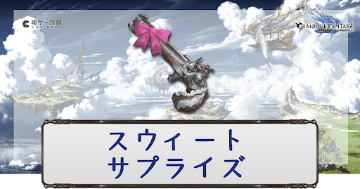 スウィートサプライズはアビ与ダメを上昇できる堅守武器で、高難度アビ軸のカイムハイランダー編成で採用する可能性はある。ハイランダー編成以外だと火力に貢献しないスウィートサプライズを入れる分だけ火力が下がり過ぎるため、採用しにくい。