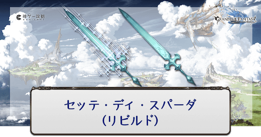グラブル(グランブルーファンタジー)に登場するレヴァンス武器のひとつ、風属性SSR剣「セッテ・ディ・スパーダ」の性能評価。奥義・スキル・ステータスと評価、最終上限解放素材の情報を掲載。必要本数も紹介しているのでシエテ剣入手時や編成時の参考にどうぞ。
