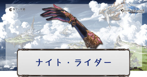 「ナイト・ライダー」は攻刃+技巧スキルを持つ武器。現状は最終解放が実装されておらず編成に入らない。最終解放でのスキル強化なども期待できるため、リサイクルやエレメント化には使わず保管しておくのがおすすめだ。
