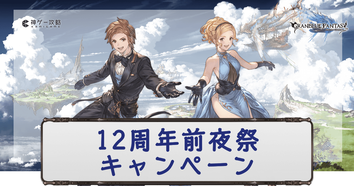 グラブル(グランブルーファンタジー)のグラブル12th Anniversary前夜祭キャンペーンの内容について掲載。開催される半額キャンペーンの対象や開催日程、詳細の仕様について一覧形式で詳しく解説。グラブル攻略の参考にどうぞ。