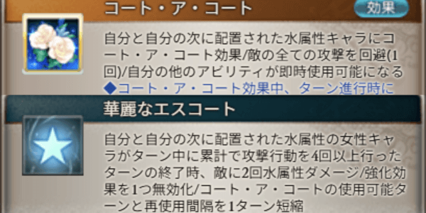 | 効果 | 自分と自分の次に配置された水属性の女性キャラがターン中に累計で攻撃行動を4回以上行ったターンの終了時、敵に2回水属性ダメージ 強化効果を1つ無効化 コート・ア・コートの使用可能ターンと再使用間隔を1ターン短縮 |