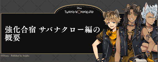 ツイステッドワンダーランド(ツイステ)のイベント「強化合宿 サバナクロー編」のイベント概要と解説をご紹介!バトルごとの敵の属性やおすすめ属性も紹介しているので、ツイステ攻略の参考にどうぞ。