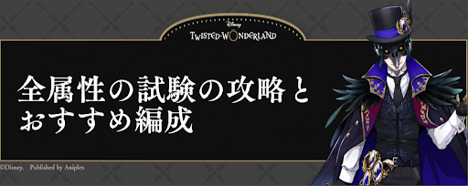 ツイステッドワンダーランド(ツイステ)の全属性の試験の攻略とおすすめキャラ編成をご紹介!おすすめカード一覧も紹介しているので、ツイステ攻略の参考にどうぞ。