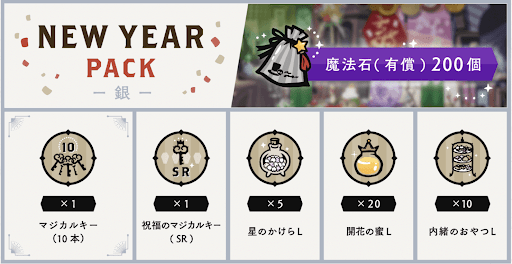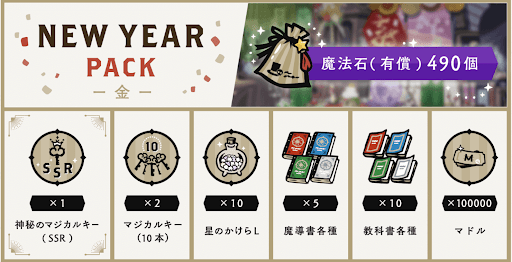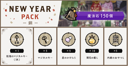 今年もショップにて、金、銀、銅の3種の「ニューイヤーパック」を販売!パックの中には昨年と同様にSSRの寮服がランダムで入手できる「神秘のマジカルキー」や星のかけら、魔導書などが封入されている。各パックは魔法石で購入可能で、金と銀は有償魔法石でのみ購入可能だ。