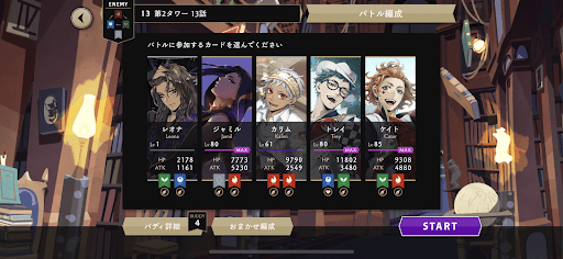 一番最初に、第1〜第3タワーを攻略するキャラを編成する。一度編成してタワーの攻略を開始すると、タワー攻略キャラが固定化され、別キャラを編成できなくなる。