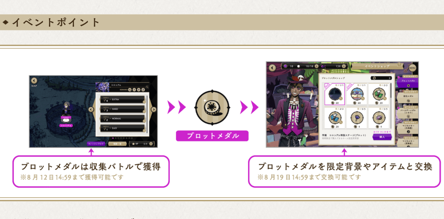 期間中、ゲストルーム内収集バトルを行うとイベントポイントが獲得できる。イベントポイントは限定ショップで「プロットメダル」と交換できる。手に入れたプロットメダルは、「プロットメダルショップ」で限定背景やアイテムと交換可能だ。