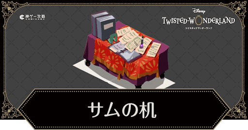 ツイステッドワンダーランド(ツイステ)のサムの机の詳細と必要素材をご紹介!サムの机の詳細やテーマ、レアリティー、寮、必要メダル数、居心地度上昇数などをまとめてありますので、ルーム機能で遊ぶ際の参考にどうぞ。