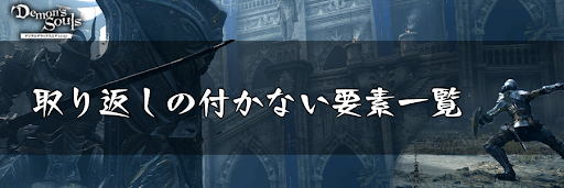 『デモンズソウル』における「取り返しの付かない要素」について紹介。に加え、取り返しの付かない要素を一覧にして紹介し、周回で取り返せる要素についても解説しているため、デモンズソウルリメイクの攻略をする際の参考にどうぞ!