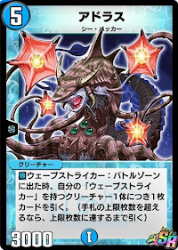 | ■ウェーブストライカー:バトルゾーンに出た時、自分の「ウェーブストライカー」を持つクリーチャー1体につき1枚カードを引く。(手札の上限枚数を超えるなら、上限枚数に達するまで引く) |
