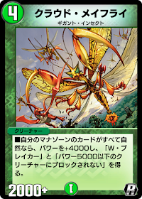 マナゾーンが自然文明だけの場合パワー6000、Wブレイカー、5000以下のブロック無視が付与される、緑単色デッキ専用のアタッカー。どのデッキでも採用しやすいが効果発動に不安定さもある「レベリオン・クワキリ」や「」に対して、「クラウド・メイフライ」は緑単では確実に効果が発動するため優先して採用される。