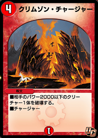 「クリムゾン・チャージャー」は、小型獣を除去しながらマナ加速が可能なチャジャー呪文だ。パワー2000以下のクリーチャーを除去する呪文としては若干コストが重いものの、相手のビートを止めながらマナ加速を狙える。