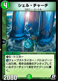 召喚時相手のアンタップクリーチャーを1体マナゾーンに送れる。相手に選択権があるものの、盤面の頭数を減らせる点は非常に優秀。また、Sトリガー持ちであるため、返しのターンに負ける確率を減らせる。