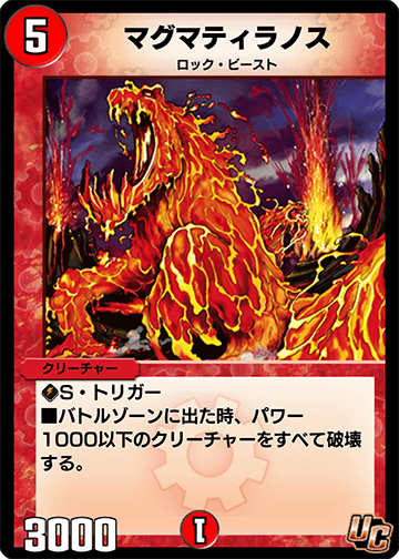 「マグマティラノス」は、限られた環境下で活躍しやすいカードだ。ラッカ速攻のようなパワー3000の「奇襲兵ブルレイザー」とパワー1000の「クックポロン」を主体に攻めて来るデッキや、自身のデッキに呪文ロックを行う「アルカディアス」が入っている場合に、「バースト・ショット」の代わりのAOEカードとして投入するなどの使い道がある。