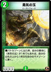 | ■バトルゾーンに出た時、自分の墓地に《勇気の玉》が1枚でもあれば、自分の山札の上から1枚目を自分のマナゾーンに置く。 |